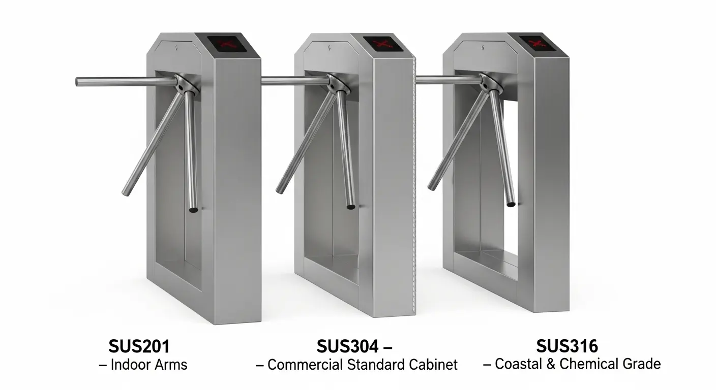 دەروازەی خولاوەی پۆڵای دژە ژەنگ ستانداردە بۆ هەر بڵاوکردنەوەی کۆنتڕۆڵی چوونە ژوورەوە کە دەبێت ساڵانێک لە بەکارهێنانی بەردەوام بمێنێتەوە, خاوێنکردنەوەی ڕۆژانە, بەرکەوتنی کەش و هەوا, یان باری هاتوچۆی ڕووبەڕوو لە خەڵک. بەڵام "پۆڵای دژە ژەنگ" لەسەر لاپەڕەیەکی تایبەت سێ نمرەی جیاوازی ماددی مانادار دادەپۆشێت — SUS201, SUS304, و SUS316 — و هەڵبژاردنی نمرەی هەڵە بۆ ژینگەکەت یەکێکە لە باوترین و گرانترین هەڵەی تایبەتمەندی لە کڕینی کۆنترۆڵی چوونە ژوورەوە.